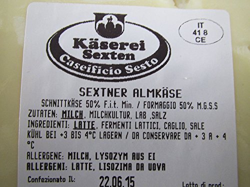 Sexten ist das Dorf der Drei Zinnen, und hier gibts den echten Sextner Käse, hergestellt in der dorfeigenen Käserei, nach bäuerlichem, handwerklichem Rezept, wie eh und je! Wir bieten Ihnen eine ganze Form eines echten Sextner Almkäses ca. 8,5 kg., einer Spezialität, welche sich bereits europaweit einen beträchtlichen Namen gemacht hat, nicht zuletzt durch den hervorragenden Geschmack und die Qualität dieses Produkts. Es handelt sich hier um einen herzhaften, leicht würzigen Schnittkäse mit kleiner, runder Lochung, dessen Reifezeit mindestens 10 Wochen beträgt. Die Rohmilch wird von den ortsansässigen Bauern täglich frisch angeliefert und wird in der Folge zu Frischmilch, Frischsahne, Butter sowie auch diesen köstlichen Käsespezialiäten verarbeitet. Gerne stehen wir Ihnen Zutaten: Frischmilch, Kulturen, Salz, Lab, Lysozym aus Ei> >   Dieser Artikel wird gekühlt versendet.  > > .